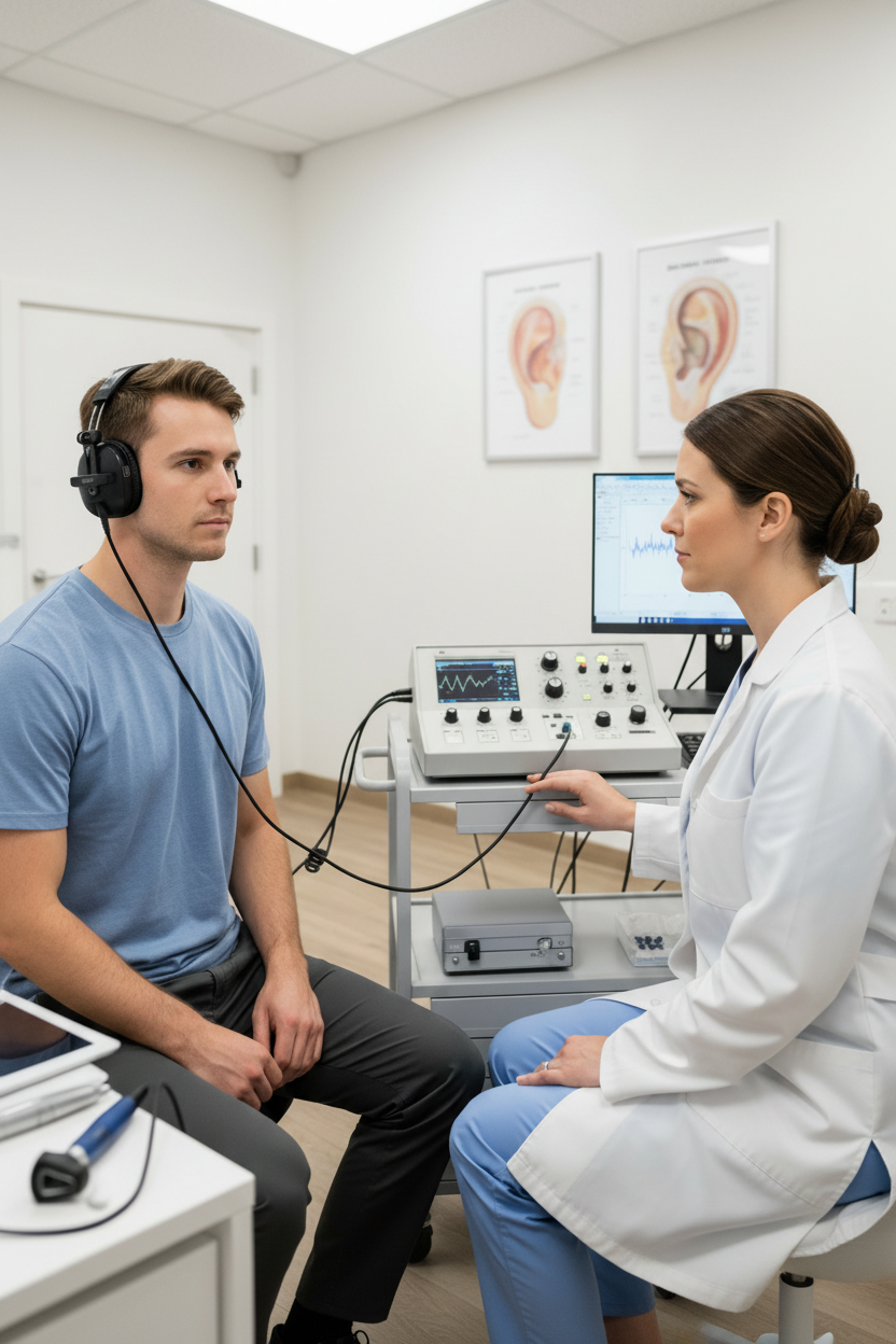 Tympanometry: Evaluates the condition of your middle ear by checking eardrum movement and detecting issues like fluid, blockage, or pressure problems.