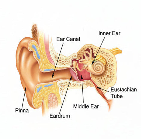 The ear is divided into three main parts: outer ear, middle ear, and inner ear, along with the auditory nerve that sends signals to the brain.