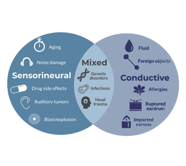 Occurs when sound cannot pass through the outer or middle ear, often due to earwax, fluid, or infection. It is usually treatable.